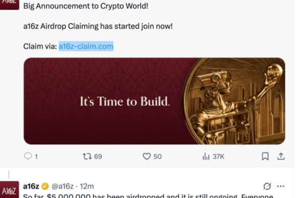 For some tense minutes on Wednesday, X users were surprised to see one of those crypto “airdrop” posts on Andreessen Horowitz’s blue check-marked account. A second tweet said that $5 million had already been given away. That account has 851,000 followers. A member of a16z’s crypto team saw the tweet and immediately posted a warning…